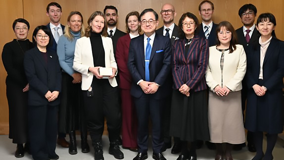 Ett antal av Japans nuvarande och tidigare Nobelpristagare samlades för att fira årets pristagare vid en högnivåmiddag som Kontoret för forskning och innovation vid svenska ambassaden i Tokyo organiserade i januari 2026. Från vänster: ambassadör Viktoria Li, Prof Koichi Tanaka (kemi, 2002), Prof Yoshinori Ohsumi (medicin, 2016), Prof Takaaki Kajita (fysik, 2015), Prof Susumu Kitagawa (kemi, 2025), Prof Shimon Sakaguchi (medicin, 2025), Prof Ryori Noyori (kemi, 2001), Prof Makoto Kobayashi (fysik, 2008), Dr Akira Yoshino (kemi, 2019), Prof Shinya Yamanaka (medicin, 2012), forsknings- och innovationsråd Lars Hammarström.