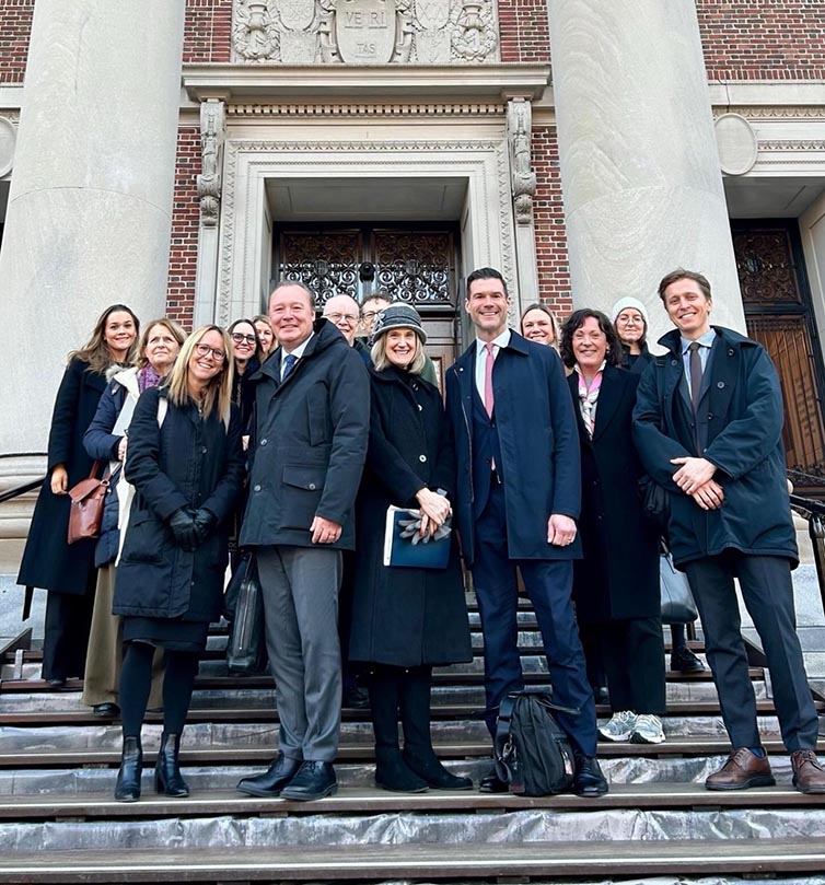 Statsrådet Forsell med delegation på trappan till Harvards Widener Library. Foto: Sveriges generalkonsulat i New York.