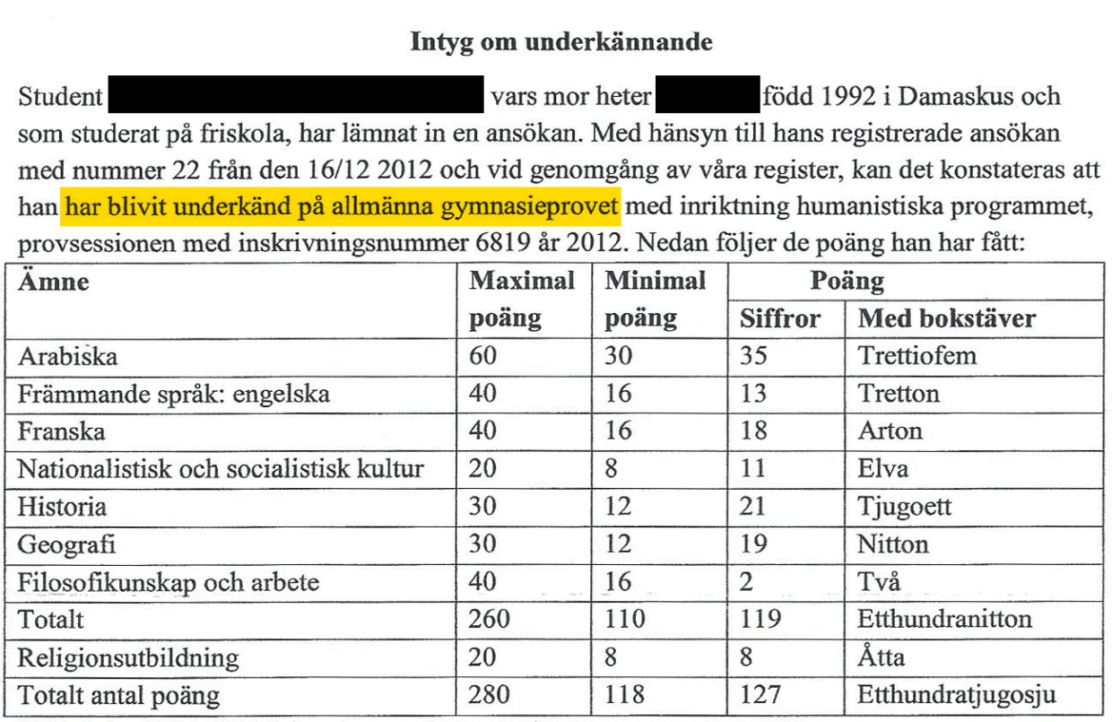 Bild av intyg om underkännande i gymnasieprov, Syrien